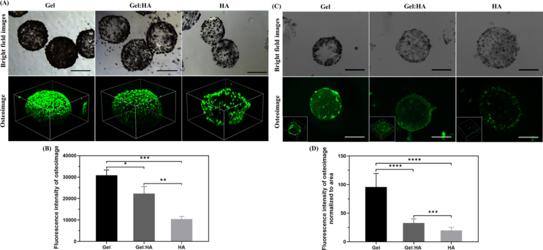 Finally, in order to verify the hypothesis that the affinity of different hydroxyapatite to Gel and HA is the reason for the difference in mineralization, the authors tested whether the nucleation and retention of hydroxyapatite (HAP) are affected by different hydrogel compositions. Impact. By incubating hydroxyapatite nanoparticles (200 nM) with cell-free microgels for 24 hours, and then washing the excess hydroxyapatite nanoparticles, the effect of hydroxyapatite on each hydrogel used in the study was tested. Affinity. The bright-field image clearly shows the difference in the composition of hydroxyapatite deposits on the surface of the microgel. Gel microgel deposits the most, followed by Gel:HA and HA microgel. Hydroxyapatite is bound to the surface of the microgel. It is further illustrated by bone image staining and intensity quantification that Gel shows stronger fluorescence than Gel:HA and HA. As a source of collagen, gelatin may be beneficial to provide nucleation sites for the formation of apatite crystals. Studies on several glycosaminoglycans have shown that HA has the weakest affinity for hydroxyapatite (Figure 8).
