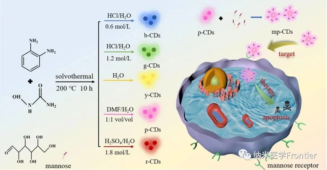 為了提高p-CDs在生物醫(yī)學(xué)中的應(yīng)用價值,研究人員利用甘露糖修飾了p-CDs的表面,得到了甘露糖修飾的p-CDs(mp-CDs)。mp-CDs可以選擇性地靶向腫瘤細(xì)胞,因?yàn)槟[瘤細(xì)胞表面有過表達(dá)的甘露糖受體。mp-CDs通過內(nèi)吞作用進(jìn)入腫瘤細(xì)胞內(nèi)部,在紫外光下發(fā)出明亮的粉紅色熒光,從而可以用裸眼辨別肝癌細(xì)胞。