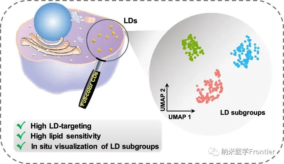 Full-color CDs是一種具有全彩色熒光發(fā)射的碳量子點(diǎn),它們由多種功能化的碳納米材料組成。Full-color CDs具有親脂性和表面發(fā)光的特點(diǎn),這使得它們可以靶向細(xì)胞內(nèi)儲存中性脂質(zhì)的細(xì)胞器——脂滴(LDs)。脂滴在維持細(xì)胞和機(jī)體的能量代謝平衡中起著重要作用,其內(nèi)部脂質(zhì)成分的變化與許多代謝性疾病相關(guān)。Full-color CDs可以通過對熒光信號高度敏感響應(yīng)內(nèi)部脂質(zhì)成分中的細(xì)微差別,從而實(shí)現(xiàn)對脂滴內(nèi)部結(jié)構(gòu)和功能的可視化和定量分析。這種利用Full-color CDs實(shí)現(xiàn)脂滴成像和檢測的方法為研究脂滴與代謝相關(guān)的生物學(xué)問題提供了新的工具和策略。