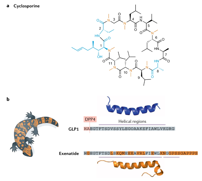 Natural products are an important source of peptide drugs, such as cyclosporine discovered in the 1960s and 1970s. This is an 11 amino acid cyclic peptide isolated from the fungus Trichoderma porous, and contains a rare D-amino acid. Cyclosporine can bind to cyclophilin to inhibit calcineurin and play an immunosuppressive effect. Cyclosporine is clinically used in the treatment of a variety of autoimmune diseases. Aurinias vorocycline was just approved last month for the treatment of lupus nephritis, which is an improved version of cyclosporine. Exenatide is the first GLP-1 to be a drug. Due to the short half-life of natural GLP-1, it cannot be made into a drug. Exenatide is only 53% homologous to human GLP-1 and cannot be used by human DPP-IV. Cut, the half-life can reach 3-5 hours. However, with the development of human GLP-1 analogs, Exenatide has declined.